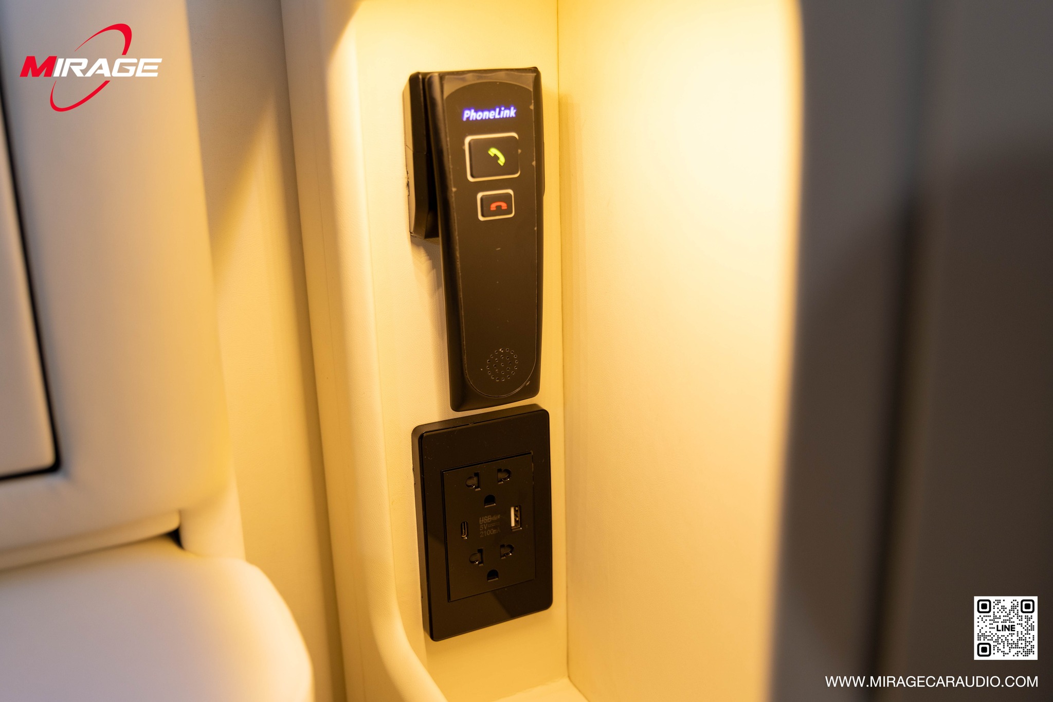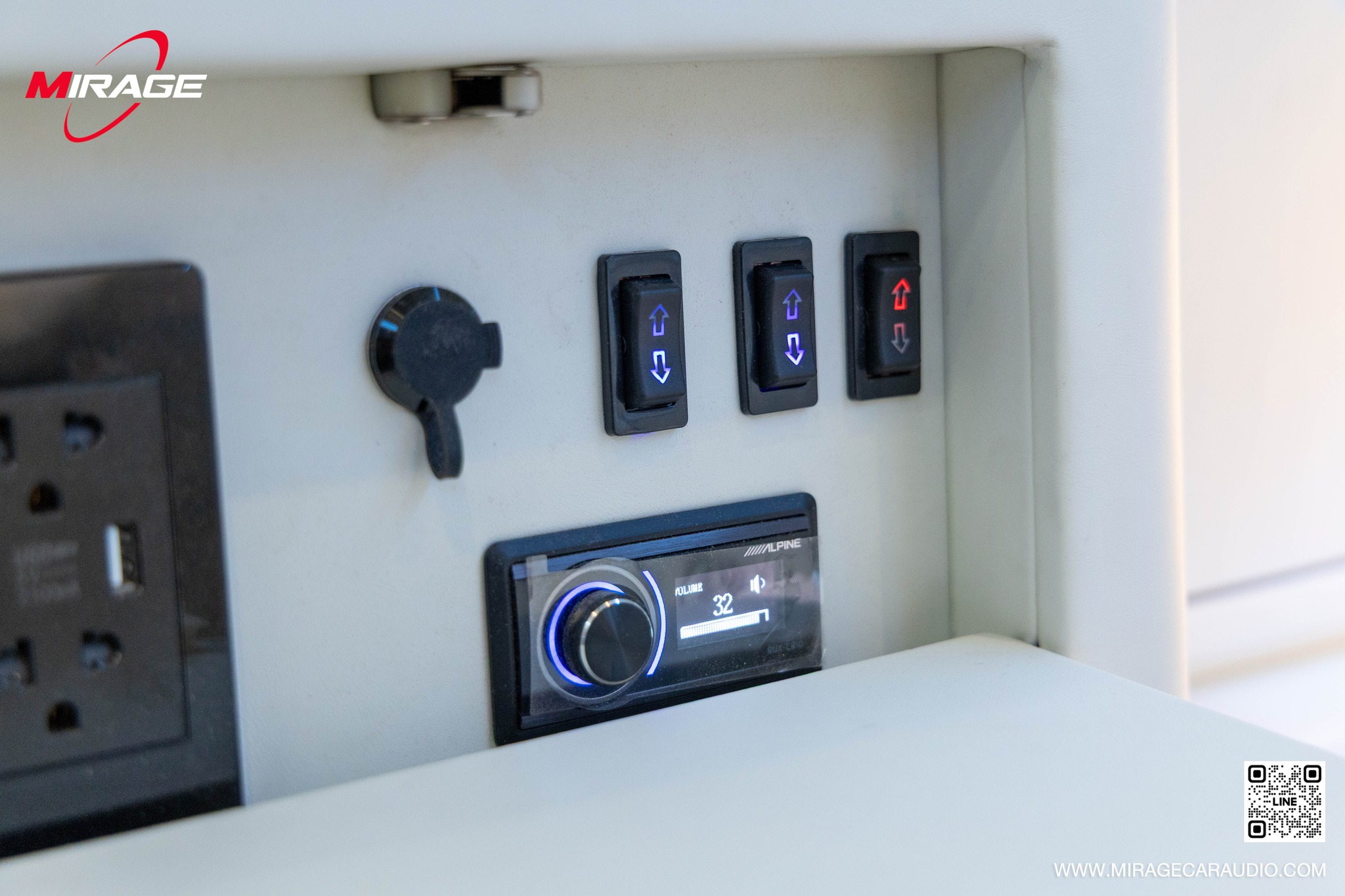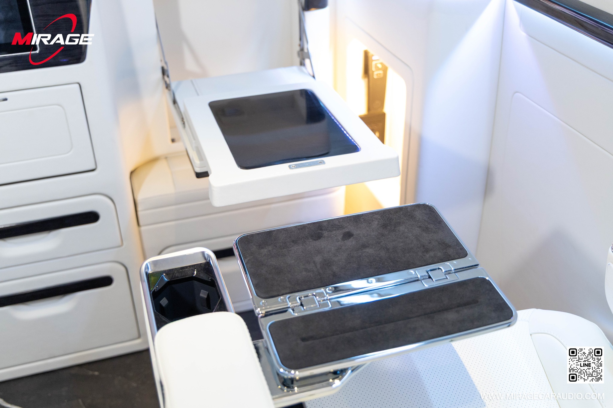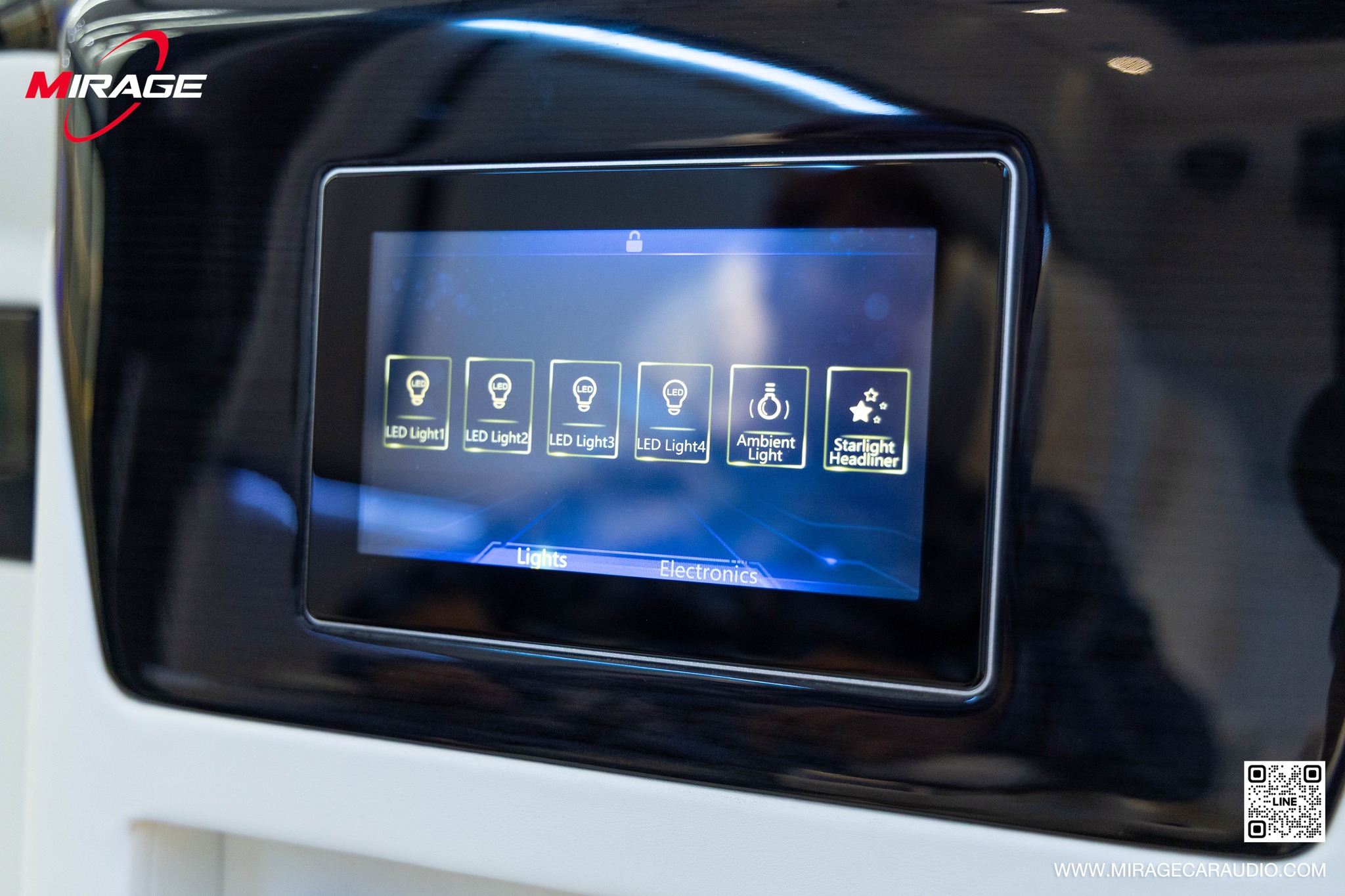 3. ห้องทำงานและห้องนั่งเล่นเคลื่อนที่ ด้วยจอขนาด 55 นิ้ว และระบบเสียง Mercury M62 คุณสามารถเปลี่ยนรถตู้คันนี้ให้เป็นห้องประชุมลับ หรือโรงภาพยนตร์ส่วนตัวสำหรับครอบครัวได้ในพริบตา ระบบเครื่องเสียงถูกปรับจูน (Digital Time Alignment) ให้เสียงพุ่งเข้าหาตำแหน่งที่นั่งอย่างแม่นยำ